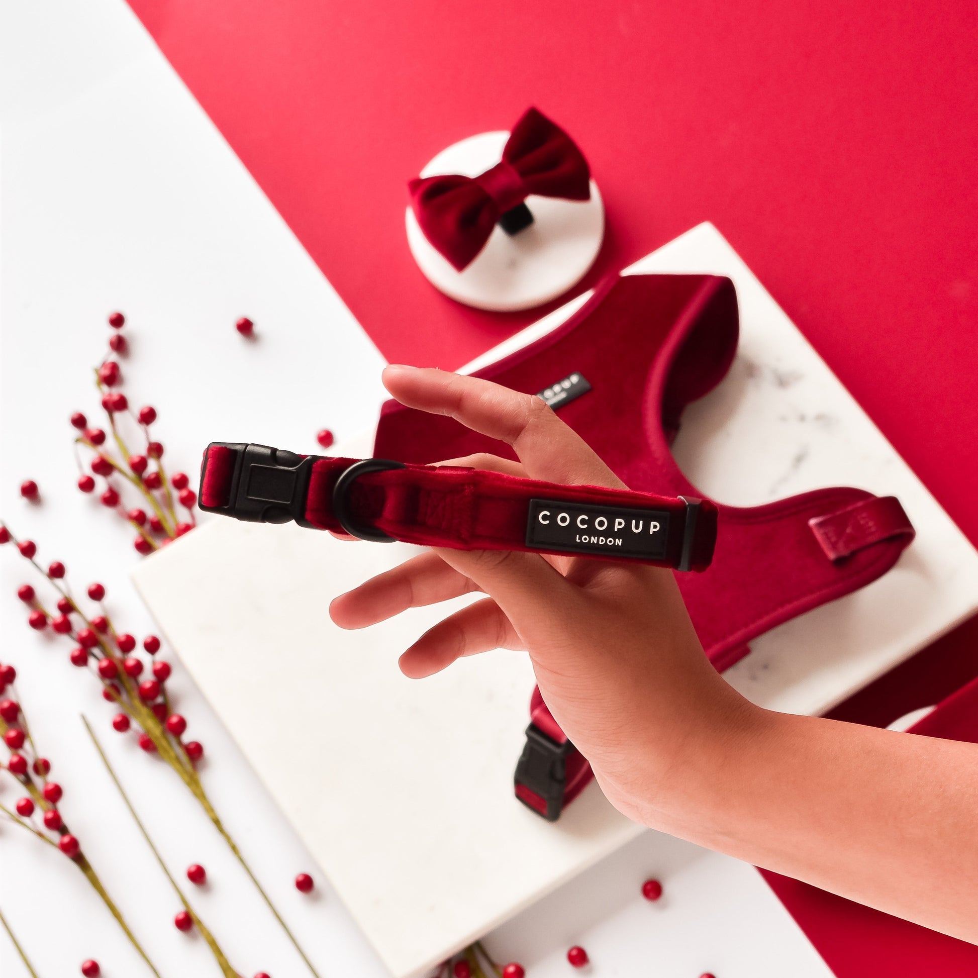 Get your furry friend in the holiday spirit with our Luxe Velvet Collar in festive berry red. Made with soft velvet for maximum comfort and a safety lock feature for added security on your dog walks. The perfect accessory for a stylish and safe Christmas!